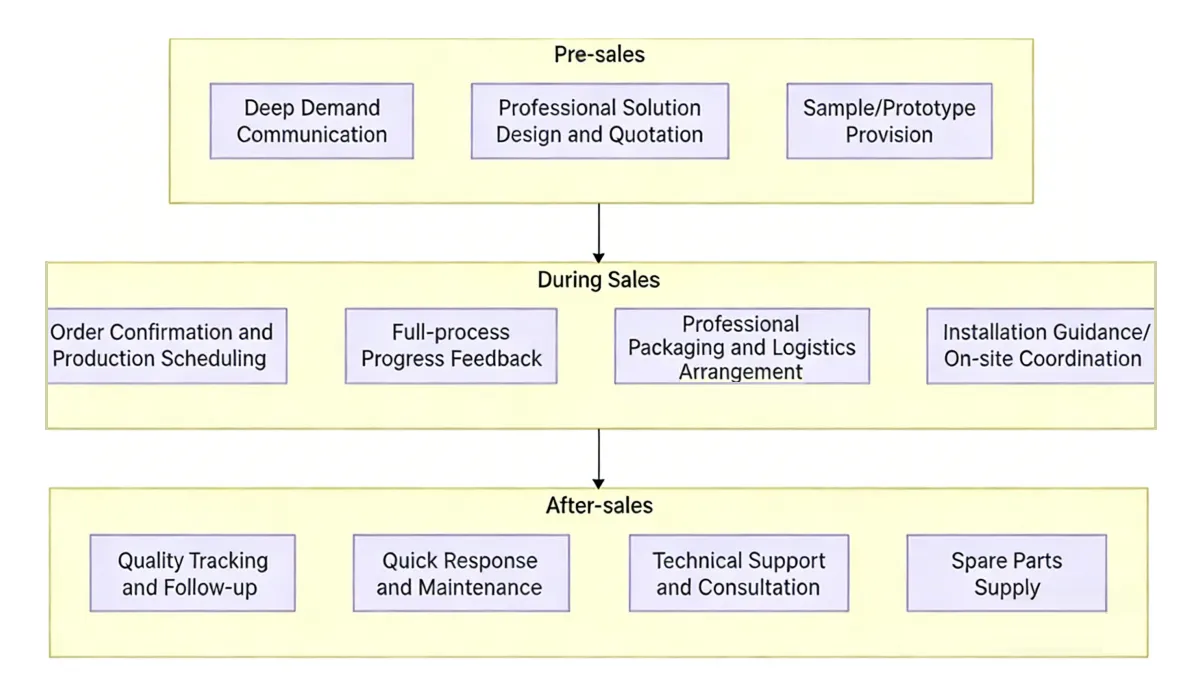 Po potwierdzeniu zamówienia YeHaoXuan zainicjuje dedykowany harmonogram produkcji, pozwalający śledzić postęp w czasie rzeczywistym; po produkcji stosujemy profesjonalne opakowanie i niezawodną logistykę, a także zapewniamy wskazówki dotyczące montażu i niezbędne wsparcie na miejscu, aby zapewnić płynną dostawę produktu.